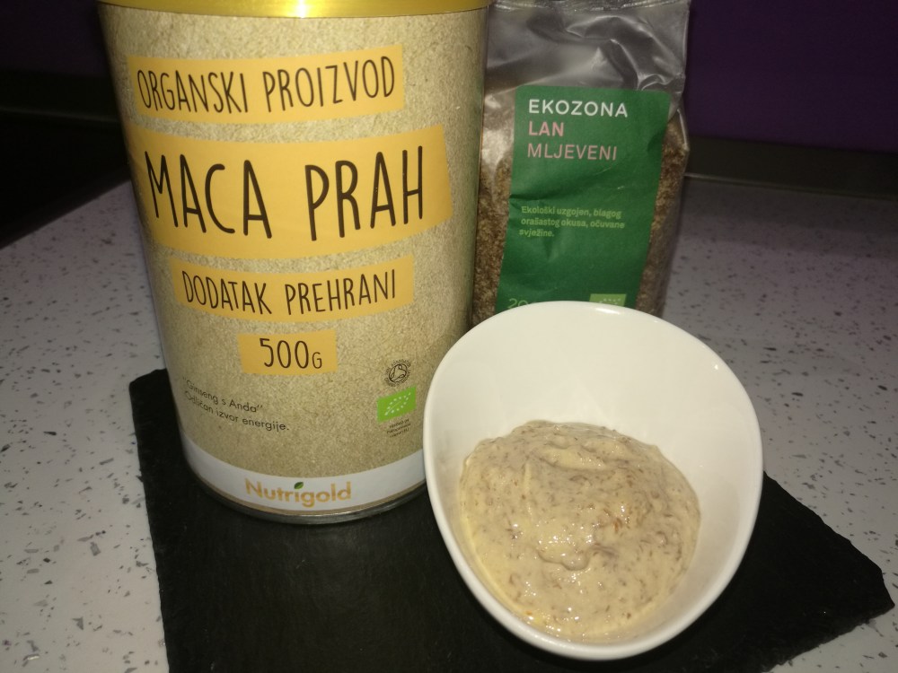 Ovo obično napravim dan prije i ostavim u frižideru ili napravim smjesu za nekoliko dana. Pomiješam macu prah i mljeveni lan s jogurtom. Lanene sjemenke stvaraju sluz oko sebe i stegnu smjesu kad odstoje neko vrijeme.