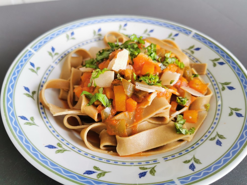 Povrće izrezati na kockice i popržiti na maslinovom ulju. Preliti pelatom i dodati začine. Kuhati 10 min i na kraju dodati nasjeckane listove svježeg bosiljka. Umak povezati sa rezancima i posuti parmezanom.