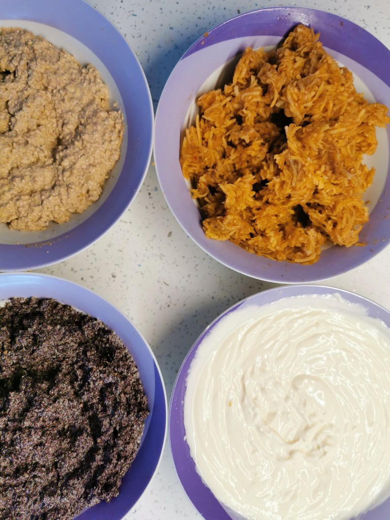 Sad kada smo djelomično pripremili sva punjenja, sirup od datulja rasporedite na tri dijela i podjednako dodajte u svako punjenje, osim od sira, kako bi ostalo bijele boje.