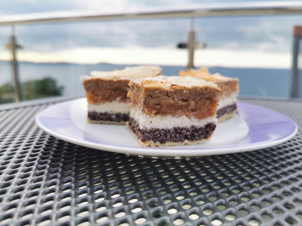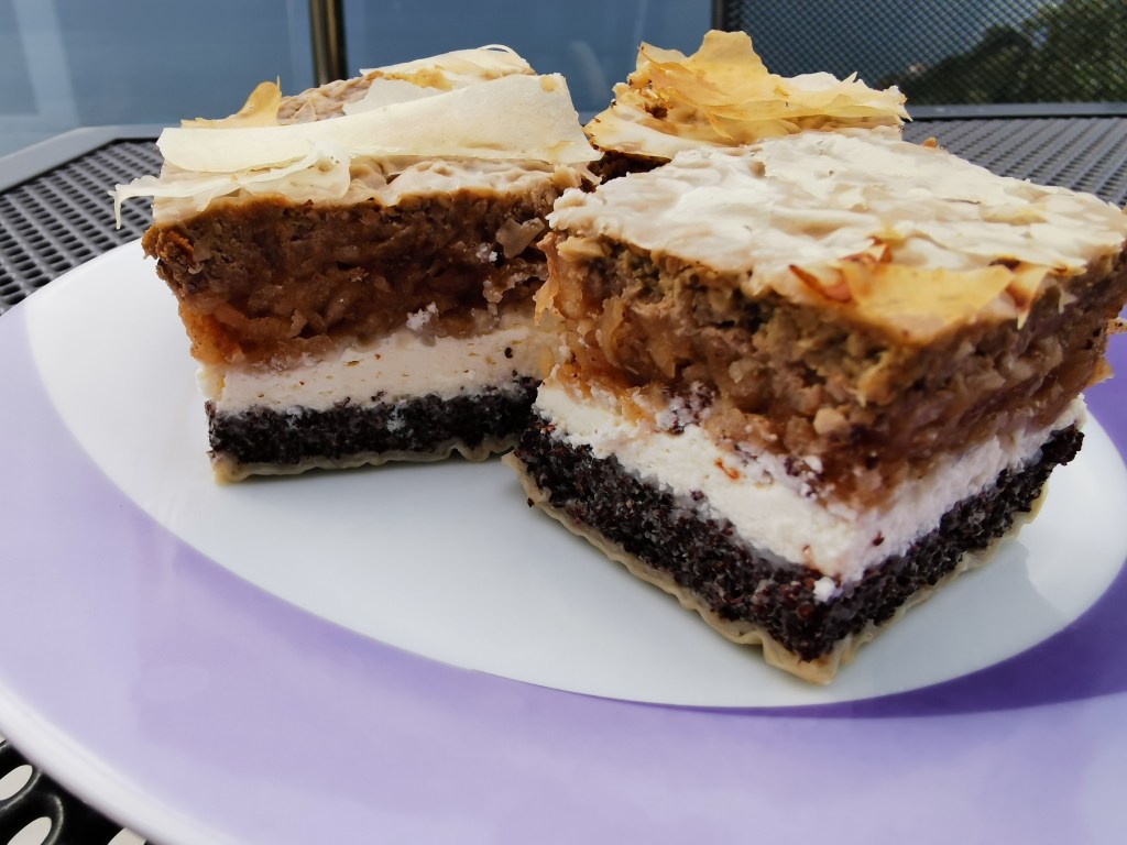 U pleh za pečenje (neki manji od onoga što se dobije s pećnicom), obložen pek papirom, složite dvije kore za savijaču. Na njih rasporedite punjenje od maka i prekrijte jednom korom. Zatim rasporedite punjenje od sira kojeg ćete također prekriti jednom korom. Slijedi punjenje od jabuka i kora, pa punjenje od oraha i dvije kore na vrh. Gornje kore sam spojila, tako što sam ih premazala kokosovim uljem.