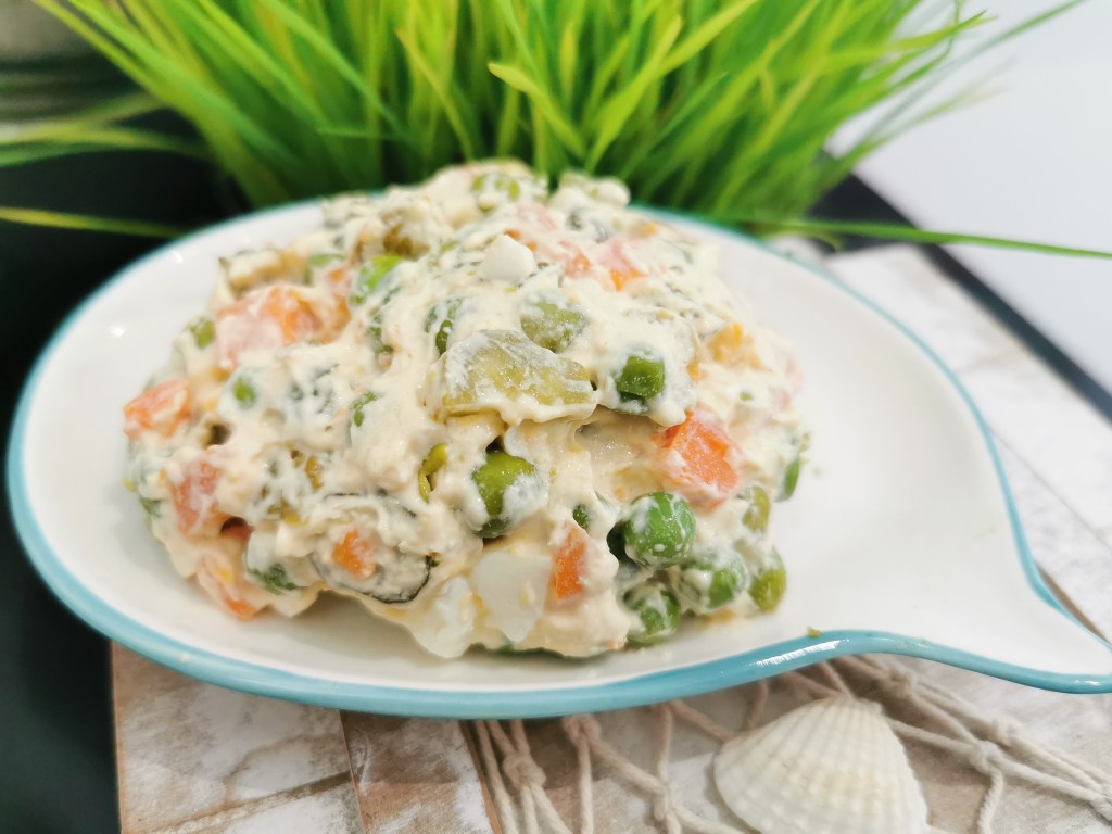 Skuhati, ohladiti i narezati jaja na kockice. Skuhati narezanu mrkvu i grašak i nasjeckati kisele krastavce. Povezati sve sastojke u većoj zdjeli. Eto to je to 🙂