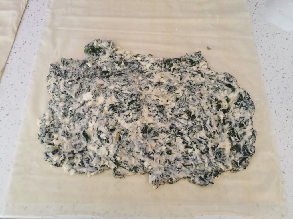 Nadjev razmazati na dvije tanje kore ili jednu deblju. Koristila sam veliku divovsku kuhinjsku žlicu od pečenja te za svaku savijaču stavila po dvije prepune divovske žlice.😊
