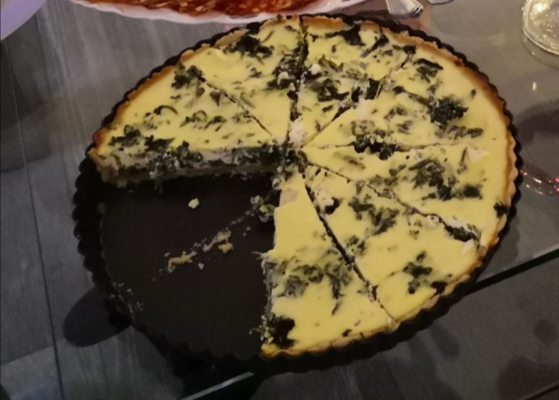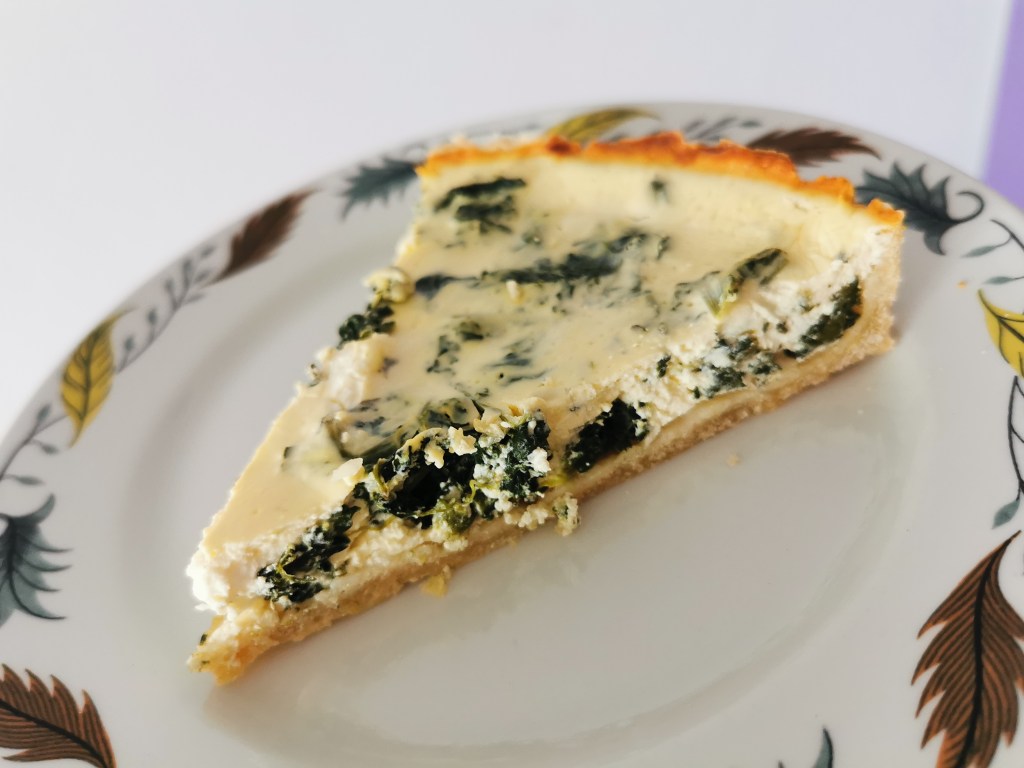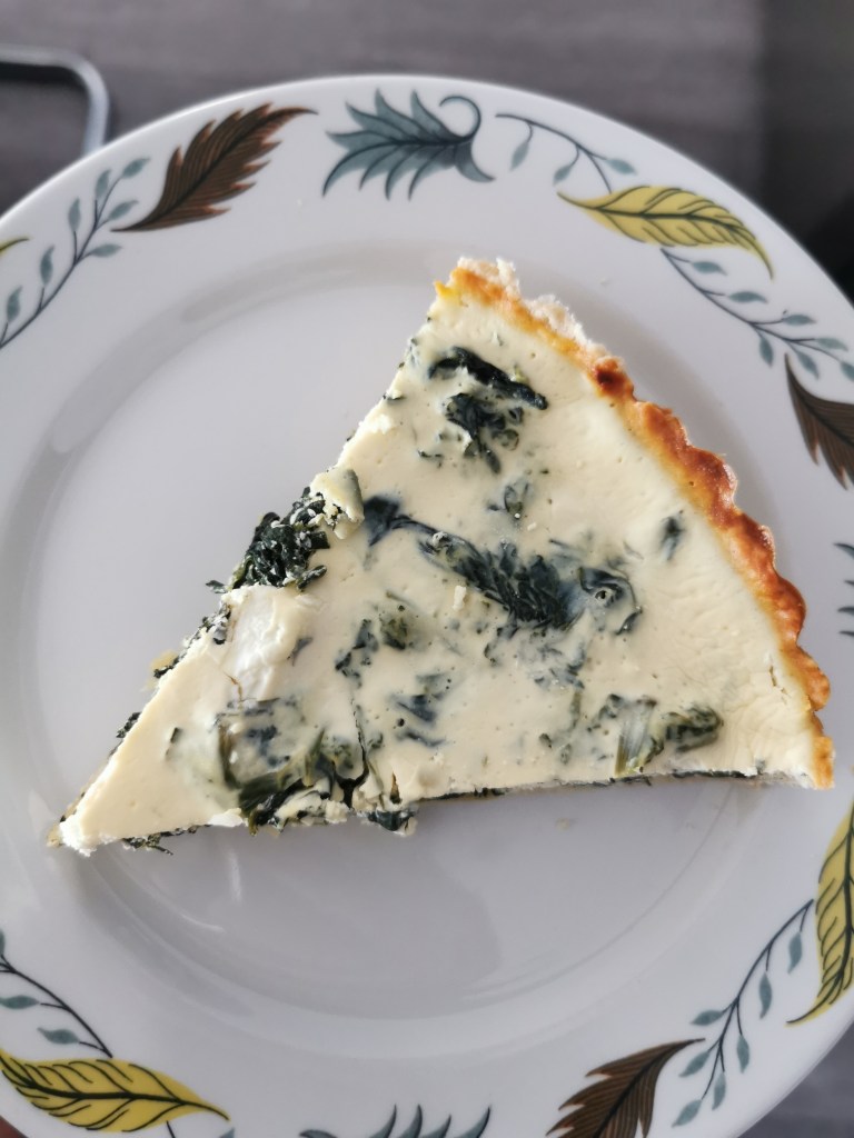 Na žlici maslinovog ulja dinstati luk te nakon minute dodati izrezani, očošćeni špinat. Posoliti i poklopiti da špinat uvene. Kada špinat uvene i pusti vodu, potrebno je pirjati još malo kako bi se reducirao višak tekućine. Izvaditi špinat i luk sa strane, najbolje u cjedilo jer svaki višak tekućine može uništiti podlogu od tijesta. Pustiti da se ohladi.