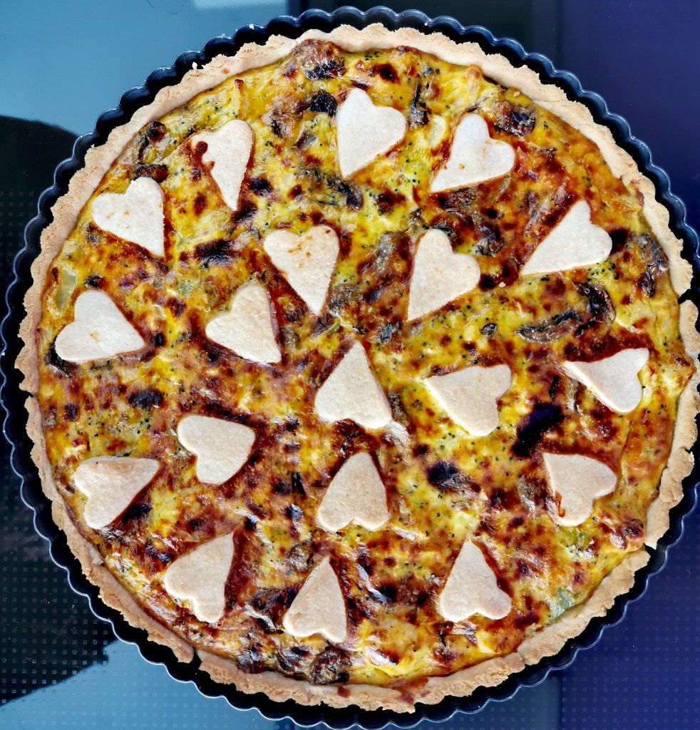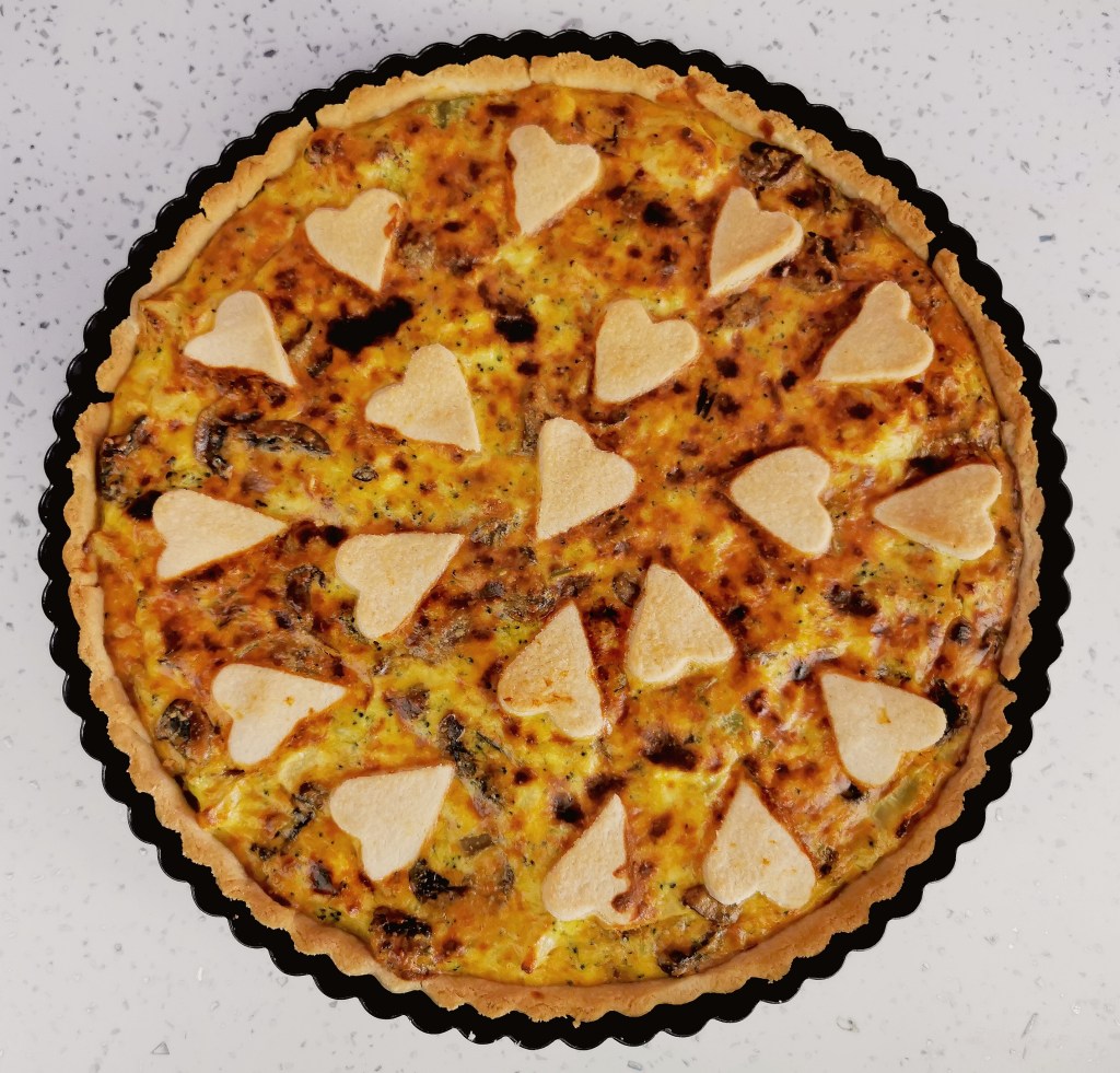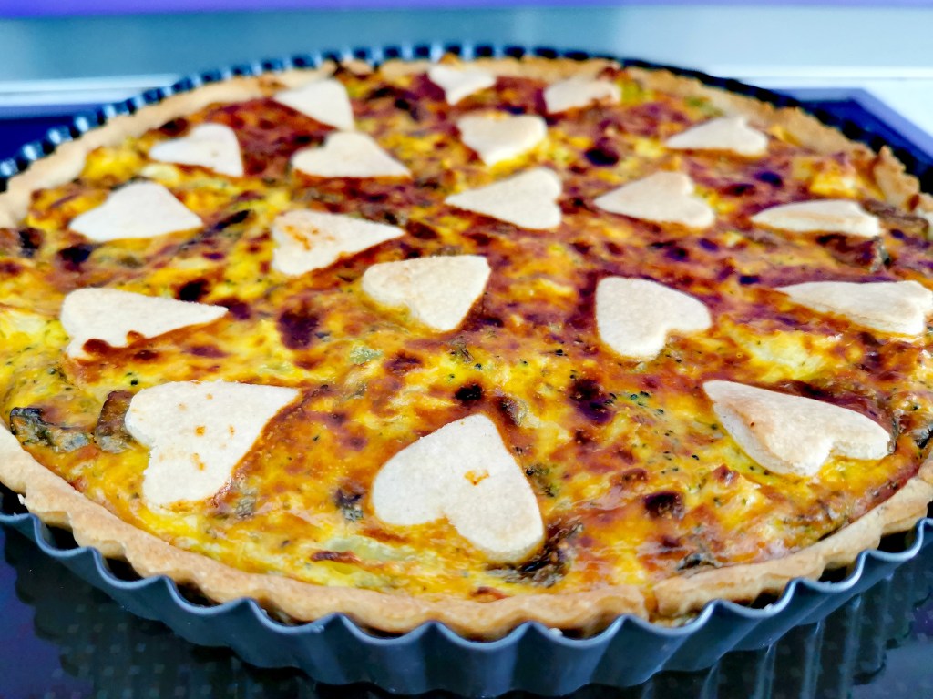 Tijesto nabockati vilicom i peći ga bez smjese oko 10 min, kako bi se stvorila korica. Izvaditi van iz pećnice i rasporediti smjesu sa povrćem i sirom po tijestu. Peći oko 20 min do pola sata.