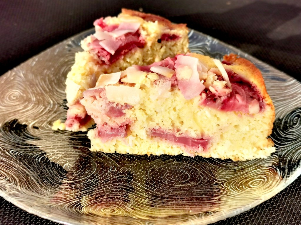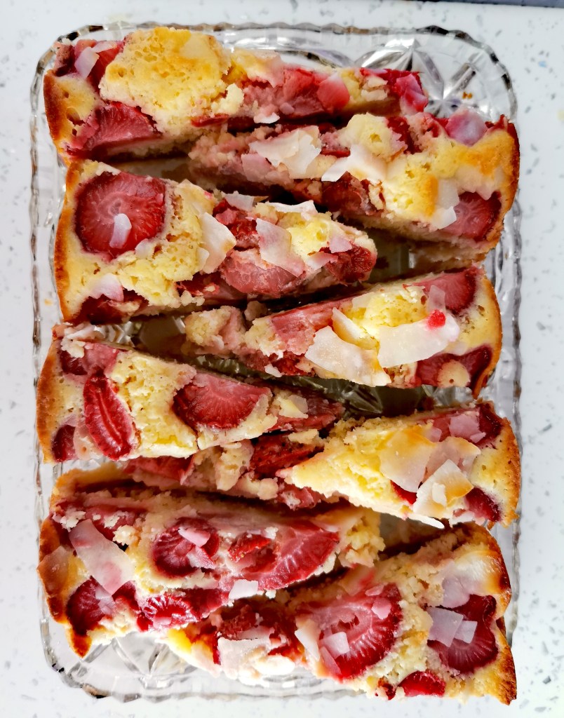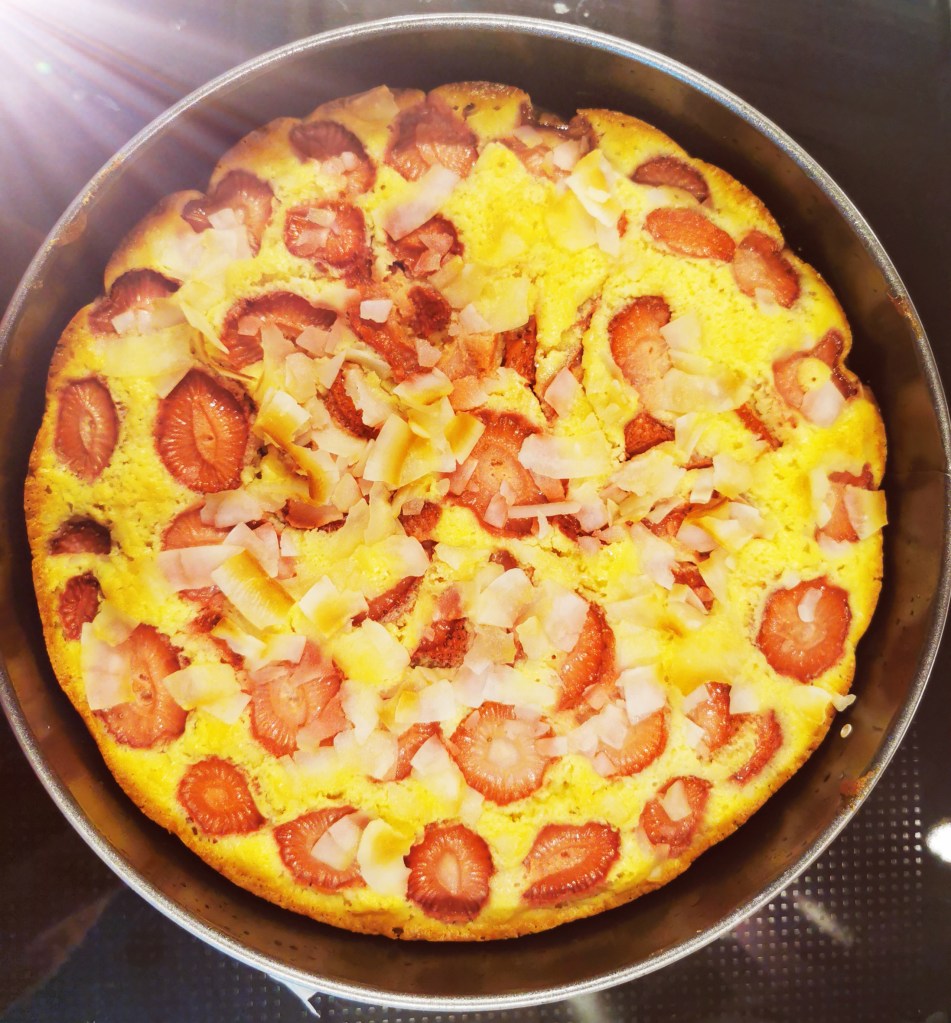Okrugli kalup za pečenje (cca 24 cm) obložiti masnim papirom pa izliti pola biskvitne smjese. Preko biskvitne smjese posložiti polovicu jagoda pa preliti ostatak biskvitne smjese. Na kraju rasporediti preostale jagode i posuti kolač listićima kokosa.