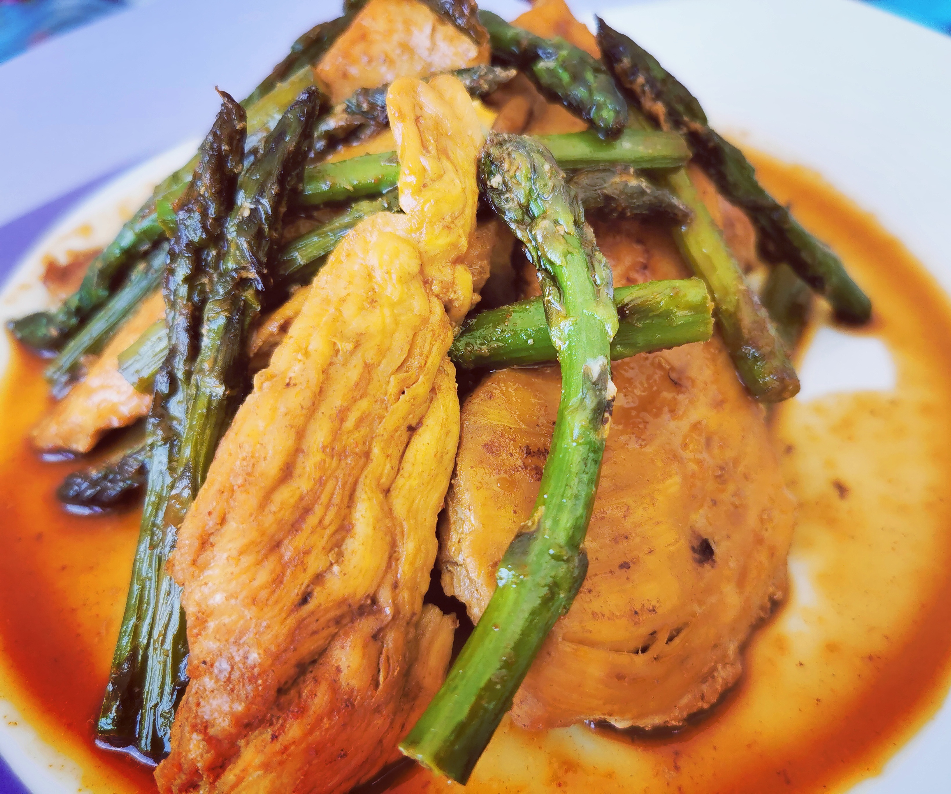 Šparoge prepoloviti i odstraniti krajeve te prepržiti na tavi premazanoj maslinovim uljem. Nakon nekoliko sekundi dodati piletinu koju je potrebno okrenuti na obe strane. Podliti je soja umakom i 1 dl obične vode.
