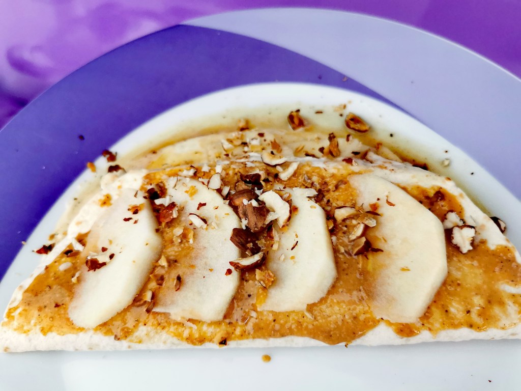 Proteine promiješati sa žlicom vode u kremastu smjesu. Tortilju možete zagrijati u mikrovalnoj, a i ne morate. Proteinima premazati tortilju i posložiti narezanu jabuku te posuti cimetom. Preklopiti tortilju i namazati maslacem od lješnjaka.
